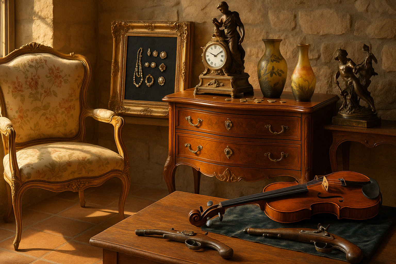 KRAEMER achat d’Antiquités & Brocante à Orgon, au cœur de la Provence installés à Orgon, entre Alpilles et Luberon, nous achetons et estimons vos antiquités et objets anciens avec passion. Que vous soyez collectionneur, héritier ou simplement curieux, nous mettons à votre disposition notre savoir-faire pour évaluer et acquérir vos pièces : fourrures, fauteuils, commodes, chambres à coucher, tableaux, cadres, vaisselles, bijoux anciens, pendules, armes anciennes, violons, instruments à cordes, monnaies, médailles, bronzes, et prestigieuses pâtes de verre signées Gallé ou Daum, Lalique..